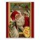 Jolly Old Papais noeis está se inclinando através de uma janela com um saco de brinquedos que está segurando uma boneca e um cavalo de brinquedo. Dentro, a janela é uma tosse de sagrado com bagas e esperando lá fora na neve estão duas renas. Saudação: Um Feliz Natal num quadro amarelo. Imagem de um Cartão-postal de Natais vintages com limite vermelho personalizado.