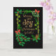 Um cartão de Natal elegante para sua madrinha, com folhagens natalinas tradicionais, azevinho e visco atados com laços vermelhos, hera e ramos de abeto e um pinheiro, tudo sobre um fundo preto. A saudação da capa frontal em letras decorativas douradas é "Desejando alegria no Natal" e "Madrinha!" em uma fonte manuscrita informal. A mensagem interna é apenas uma sugestão e você pode personalizá-la facilmente para atender às suas necessidades ou excluí-la completamente se preferir um cartão "Em branco por dentro".