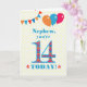 Um cartão de aniversário colorido para um sobrinho de 14 anos, O grande número 14 está cheio de um padrão laranja, vermelho e azul, esboçado em azul brilhante. Há balões e bunting no topo, em cores coincidentes e a saudação do cobrir dianteiro é, 'Sobrinho, você tem 14 anos hoje!' em letras brilhantes vermelhas e azuis, em um fundo bolinhas amarelo e branco muito pálido, com estrelas vermelhas e laranja em cada lado da palavra 'HOJE!'. A mensagem dentro pode ser facilmente personalizada ou excluída se você desejar.