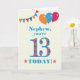 Um cartão de aniversário colorido para um sobrinho de 13 anos, O grande número 13 está cheio de um padrão laranja, vermelho e azul, esboçado em azul brilhante. Há balões e bunting no topo, em cores coincidentes e a saudação do cobrir dianteiro é, 'Sobrinho, você tem 13 anos hoje!' em letras brilhantes vermelhas e azuis, em um fundo bolinhas amarelo e branco muito pálido, com estrelas vermelhas e laranja em cada lado da palavra 'HOJE!'. A mensagem dentro pode ser facilmente personalizada ou excluída se você desejar.