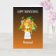 Um cartão de Ação de Graças com um belo jarro de flores para sua avó, em cores brilhantes e quentes! As flores laranja, amarela, vermelha e branca estão em um jarro branco, com as palavras "Dê aos Obrigados a inscrição azul clara. A saudação do cobrir é, 'FELIZ OBRIGADO' no topo e 'Mamaw!' abaixo das flores, em letras brancas sobre um fundo castanho escuro que desaparece para laranja enferrujado no fundo. A mensagem dentro é apenas uma sugestão e você pode alterá-la facilmente ou apagá-la completamente se desejar.