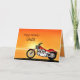 Uma moto semelhante a um Harley parado ao lado do mar com um glorioso pôr do sol laranja. Um cartão de excelente para qualquer pessoa que goste de bicicleta e motocicletas. Veja toda a gama de cartas para idades e relacionamentos na minha loja. Todos os direitos de autor da trabalho de arte Norma Cornes