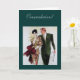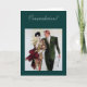Ilustração vintage de um casal muito feliz e muito elegante. Fundo verde escuro para o cartão e acima em letra cursiva verde clara "Parabéns"