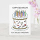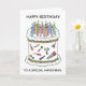 Um desenho de um grande bolo de aniversário branco decorado com imagens de várias ferramentas ao redor das bordas do bolo.