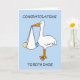 Um desenho de uma grande cegonha segurando um menino em uma folha branca do bico. A imagem é colocada sobre um fundo de cor azul pálido e é acompanhada pela expressão "Parabéns para ambos os Pais.