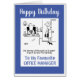 Cartão de aniversário do Office Manager. O assistente pessoal está saindo cedo porque ela não chegou tão tarde. Personalize com seus próprios detalhes e mensagem. Ideal cartão de aniversário engraçado para um gerente do escritório. Fundo azul escuro.