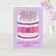 Um grande bolo de aniversário de desenhos brancos e cor-de-rosa contra um fundo macio, com várias velas sobre ele. As palavras "Feliz Aniversário Beverly" acompanham a imagem.