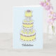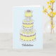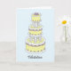 Um bolo de vários andares cor-de-rosa, branco e limão, com gelo, contra um fundo azul pastel. A imagem é acompanhada pela palavra 'Felicitações'.