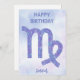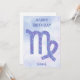 Este cartão de aniversário bonito, personalizado, roxo e lavanda feliz de Virgem apresenta seu sinal astrológico do Zodiac em um belo brilho como as constelações. Personalize este design de astrologia fofo com o seu nome em script cursivo para alguém que faz aniversário no final de agosto ou no início de setembro.
