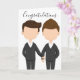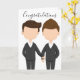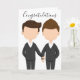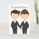 Um lindo cartão de parabéns de casamento para um casal gay que está se casando. Apresenta um desenho de dois homens morenos vestindo smokings e de mãos dadas. Um cartão de saudação LGBT fofo para parabenizar dois homens.