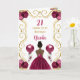 Este convite de aniversário apresenta um quadro elegante de ouro, uma bela princesa com pele escura e um vestido vermelho burgundy, flores e um balão.