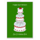 Um bolo de casamento estilo cartoon em três camadas, que é gelado com gelo vermelho e branco, colocado sobre um fundo verde profundo. As palavras "Feliz aniversário do casamento da véspera de Natal" acompanham a imagem.