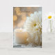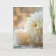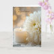Uma vela brilhante senta-se ao lado de uma grande flor de crisântemo macio numa superfície de rendas rodeada por luzes quentes nos fundos para parabéns de casamento. Todo o texto pode ser alterado.