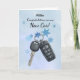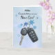 Parabéns a alguém especial com um cartão de carro novo personalizado com seu nome. Este design de inverno mostra chaves aquáticas acentuadas com flocos de neve azuis nítidos, simbolizando marcos excitantes e novos começos na estação de neve. Perfeito por personalizar para celebrar um primeiro veículo, um presente de carro de férias ou qualquer passeio novo no inverno.