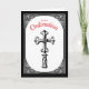 Uma ilustração de um ornamentado preto e de uma cruz tradicional com um ponto vermelho destacando o centro da cruz. O trabalho de rolagem envolve a cruz. Este cartão é perfeito para felicitar alguém pela sua ordenação religiosa, e para oferecer os melhores votos.