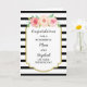 Parabéns no cartão do dia do casamento para mãe e padrasto com listras brancas e pretas e flores cor-de-água rosa, e verso sentimental.