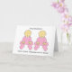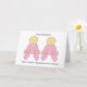 Garotas gêmeas em roupas cor-de-rosa combinando e as palavras "Parabéns em se tornar Excelentes Avós a gêmeos".