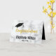 Na frente, esta placa de graduação tem um boné formando preto no canto superior esquerdo. O texto de exibição diz 'Parabéns no script faux gold. Personalize a placa com o nome do formando em texto preto. Você pode até adicionar a classe de ano com o nome. O fundo é uma elegante mármore branco falso. No dentro da placa, há um dentro de mensagem e um lugar para adicionar o nome do formando e o nome do remetente dentro.