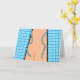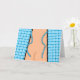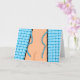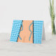 Parabéns engraçados na Colonoscopia, cartão de saudação de papel do Hospital Aberto. Ilustração de um vestido de hospital aberto revelando as costas de alguém. O palhaço está em um tecido azul e azul-esverdeado com padrão. ©Shoaff Ballanger Studios.