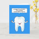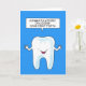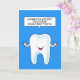 Um dente de desenho animado dizendo "Parabéns em perder seu primeiro dente". A imagem tem um fundo de cor azul.