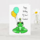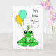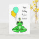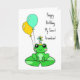 Cartão de aniversário. Cartão de aniversário personalizado com sapo fofo em uma almofada de lírio em um chapéu de aniversário com balões.