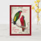 Parabéns a um par perfeito de pássaros amorosos quando você envia esta bela pintura vintage de papagaios de dois Lorikeets de Kuhl contra um fundo damasco vintage e um sentimento doce. Perfeito para as celebrações do dia do casamento para o casal gay ou lésbico enquanto se unem.