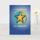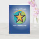 Um cartão feliz e amigável para enviar seus parabéns a um amigo. Uma estrela brilhante em cor laranja, vermelha e preta num círculo multicolorido, para que o seu amigo especial saiba o quão orgulhoso é deles