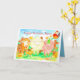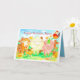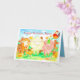 Um cartão de boas-vindas de feliz aniversário com nome personalizado, com animais de galeria, incluindo uma vaca, ovelha, porco, galinha, galo e um cão curioso ilustrado com aquarela.