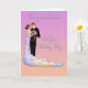 Belo desenho artístico de uma noiva em seu vestido de noiva único em tons de lavanda, amarelo e rosa adornado com flores silvestres brancas, sua cauda é longa e elegante, ela é acompanhada pelo noivo vestido com um smoking preto tradicional. O fundo deste cartão é um gradiente de lavanda e rosa e as palavras "Parabéns pelo seu casamento" estão escritas lindamente em letras brancas na frente. O interior do cartão diz "Desejando a vocês uma vida inteira de felicidade conjugal". Este cartão pode ser personalizado com seus próprios desejos, e o nome da noiva e do noivo também podem ser exibidos.