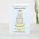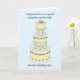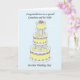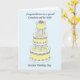 Bolo de casamento grande, em camadas, cor de limão sobre um fundo azul claro com as palavras 'Para um neto maravilhoso e sua esposa no dia do casamento'.