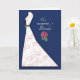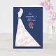Uma flor de peônia rosa é destacada neste fundo azul-marinho. A flor de peônia também está no cinto verde no vestido elegante com espirais em rosa. Parabéns e votos de felicidade para a noiva em seu chá de noiva!