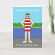 Uma ilustração de um homem com bigode grande, vestindo um boné de natação e roupa de banho vermelha e branca listrada. O homem está de pé no lado de um lago com as mãos sobre os quadris. As palavras "Parabéns numa natação incrível" acompanham a imagem.