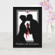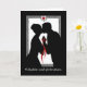 Tillykke med forlovelsen. Parabéns no noivado, cartão de boas-vindas em papel escrito em dinamarquês, Dansk. Design preto e branco elegante com coração vermelho, fita vermelha, homem silenciado e casal mulher, e estrutura intrincada. O texto do dentro traduz-se em "Melhores desejos para o seu futuro juntos." Arte, imagem e direitos de autor versos © Shoaff Ballanger Studios, 2022.