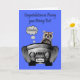 Felicite seu ficar em casa por ter passado no teste de direção com um guaxinim dirigindo um carro com escape saindo pelas traseiras e doce escrito na placa de matrícula. O carro é do J. Rett Grapics