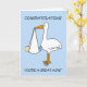 Uma gigante cegonha de desenho animado segurando um menino em uma folha branca que pende do bico. A imagem tem fundo azul pálido.