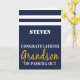 Este marinho britânico náutico que passa a carta de passagem é uma forma excelente de felicitar o seu neto pelo seu sucesso e por toda a formação de duros que até agora tiveram na sua carreira militar. design de lenço azul marinho com listras brancas e parabéns neto ao desmaiar com o nome do formando naval incluído.