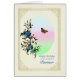 Um belo cartão de aniversário floral para um parceiro. Um buquê adorável de flores azuis e brancas com uma borboleta marrom em voo. A imagem tem uma delicada estrutura de ouro.