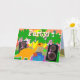 Festa! Feliz Cartão de Jovem de Aniversário. Um pequeno e bonito desenho animado, dinossauro laranja, DJ Party Diplodocumental com legal óculos de sol tocando alguma música excelente em uma festa de dinossauro balançante em uma ilha tropical com palmeiras e sol amarelo com notas de música e estrelas a cores saindo da auto-falante. Dentro do cartão: Stegossauro fofo, Diplodocuments, Tricerátopos numa paisagem pré-histórica feliz com palmeiras, serra e vulcão com estrelas coloridas com texto personalizável "Feliz Aniversário", todos os dinossauros partidários e o ovo bebê dinossauro e Tyrannosaurus Rex (T-Rex) roxo. Adicione/ Altere seu texto pessoal e personalize com suas imagens e textos! Um adorável cartão de dinossauros de desenho animado para cartões de aniversários a um pequeno grande fã de dino!