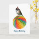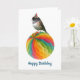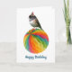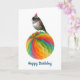 A little junco wearing a party hat perches on a colorful party decoration. Give someone this fun bird birthday card.