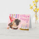 Fun card with a cute pug wearing a spotty party hat celebrating someone's birthday with candles, cake and streamers.
