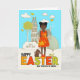 Laranja, amarela, verde e azul criam uma Páscoa tipo primavera para uma menina com uma criança americana étnica vestida no seu melhor domingo e seu coelho companheiro.