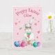 Coelhinho de Páscoa em aquarela adorável está abraçando uma cenoura que está guardando para um lanche tarde da noite. Ele está cercado por lindos ovos de Páscoa coloridos. No topo está escrito "Hoppy Easter" (Feliz Páscoa) e você pode personalizar com o nome da criança. Há também alguns corações cor-de-rosa e tudo está contra um fundo cor-de-rosa com bolinhas brancas. O interior do cartão tem ovos de Páscoa coloridos e um desejo de Páscoa à direita, que também é personalizável. A parte de trás tem uma topiaria de ovos de Páscoa com um coelhinho espiando. Não importa para onde você olhe, há outro design adorável!
