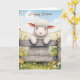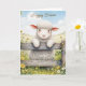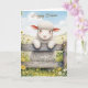 Um carneiro liso inclina-se sobre uma cerca de madeira rodeada por flores silvestres coloridas sob um céu azul brilhante Todo o texto é editável.