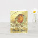 A frente deste design de cartão de agradecimento em estilo vintage apresenta a mensagem de agradecimento "Obrigado!" em texto com aparência de escrita à mão, juntamente com uma representação de um passarinho empoleirado em um galho. O interior apresenta uma mensagem personalizada de agradecimento. Um cartão como este pode ser usado para agradecer a alguém que fez algo especial.