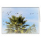 Pássaros que voam altamente acima de uma palmeira. Céus azuis no fundo.