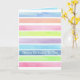 Um bonito cartão de saudação de aniversário feliz, decorado com um padrão de listras largo, feito com lavagens de aquarelas pintadas manualmente em tons pastéis de rosa, pêssego, fárteno, verde, claro e azul escuro com sotaques de listras brancas. Você pode remover ou editar o texto para ajustado das suas necessidades.