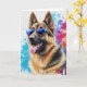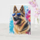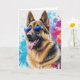 Cartão de cumprimentos em branco de um Pastor Alemão com óculos de sol legais e fundo de arte splash.