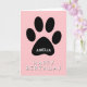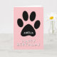 A Pata Gira Gira Imprime Um Cartão De Aniversário Feliz, Rosa. Cartão de saudação de aniversário com uma pata preta de cão, um nome e um texto de aniversário de Feliz num fundo rosa. O nome está na impressão de pata - personalize o cartão com o seu nome. Você também pode mudar o texto Feliz aniversário.