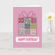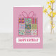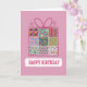 Este é um cartão de aniversário com um presente de aniversário criado com um miniaplicativo de nove blocos de retalhos usando um ponto de zag em ziguezague. O pano de fundo é a bolinhas e o texto diz: "Feliz Aniversário".