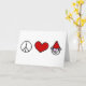 Apresenta um desenho animado divertido de um sinal de paz, um coração vermelho e um gnomo com um chapéu vermelho.